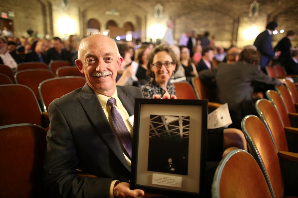 President of AIA Philadelphia, Jim Rowe, is presented with the 2015 Louis I. Kahn Memorial Awardfeaturing Lionel Freedman’s 1953 portrait of Louis Kahn under the “The Tetrahedral Ceiling” at theYale University Art GalleryPhoto by Joe Kaczmarek for the Philadelphia Center for Architecture
